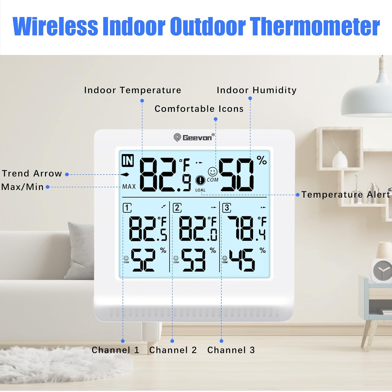 Geevon Indoor Outdoor Thermometer Wireless with 3 Remote Sensors, Digital Hygrometer Thermometer.
